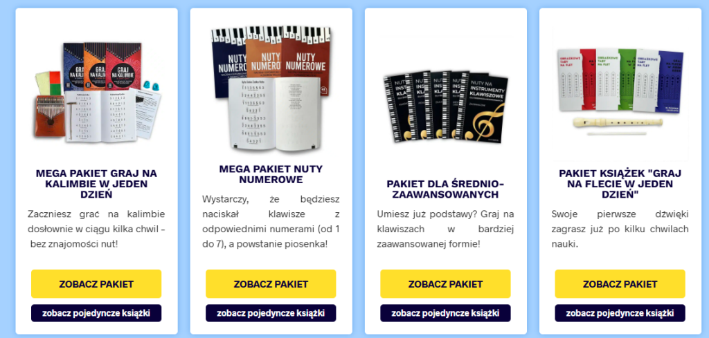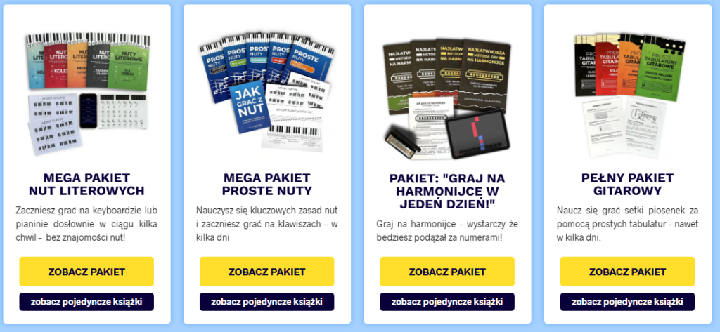 - pakiety kursów i nut połączone w zestawy, dzięki którym można oszczędzić i uzyskać więcej materiałów jednocześnie.